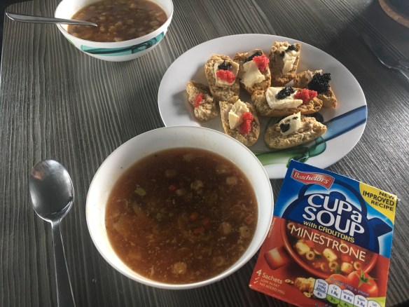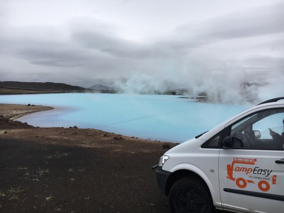 真正能夠拍照的地方,是米湖溫泉Mývatn Nature Baths。由於已經下午了,我們在這邊很快地煮點東西吃。在租車中心的食物交換處有拿到幾包湯,我們拿來煮煮再搭配乾麵包。當然,鵝肝醬魚子醬起司沒有怕的給它加下去。