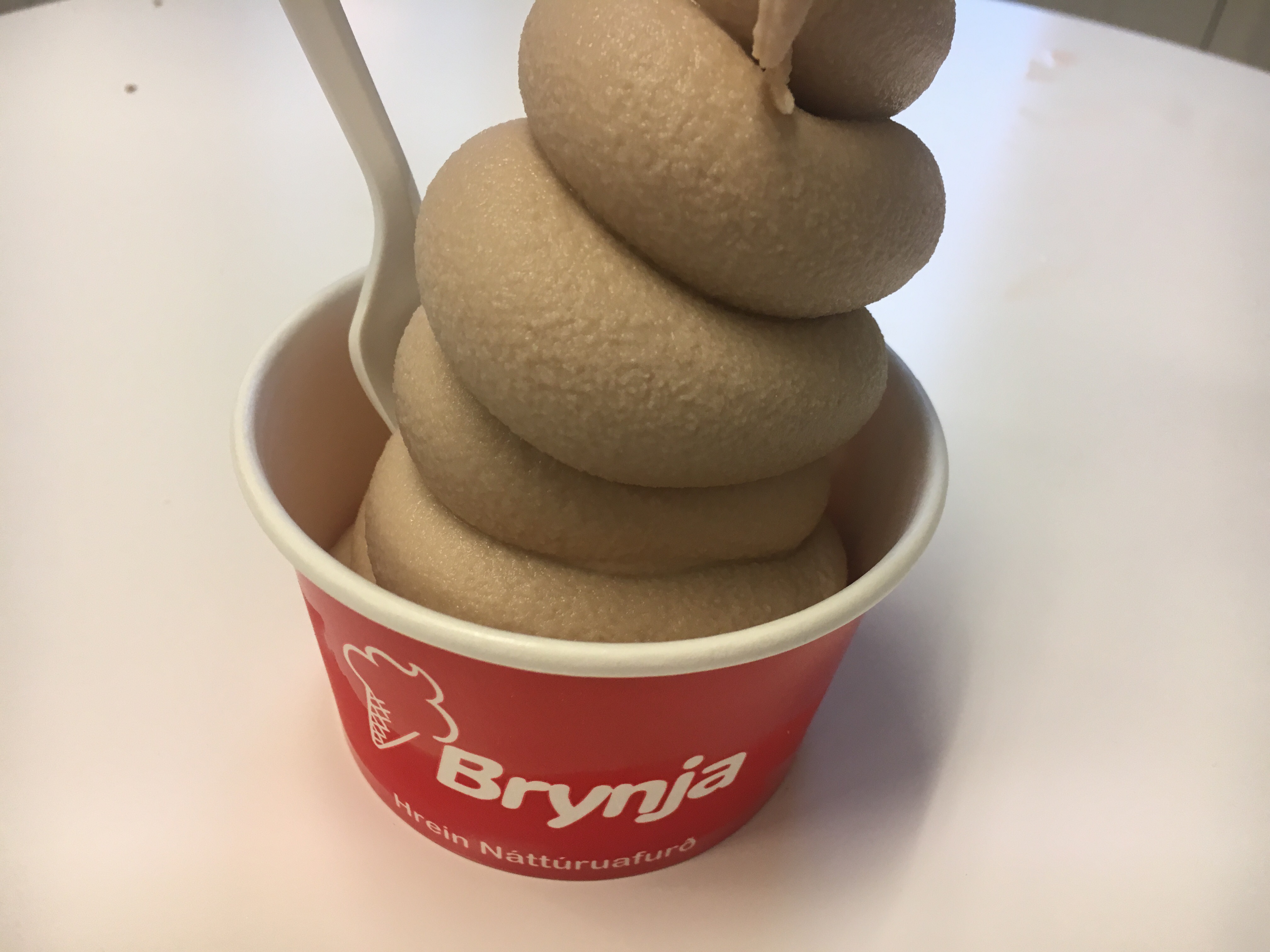到了亞庫來利的第一間事情就是去吃冰淇淋Brynja。很奇怪的是停車場停得滿滿都是車,但是裡面只有一組客人。這個冰淇淋是蠻好吃的啦,不過我們沒有試著點配料。