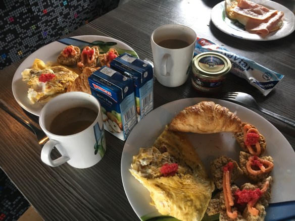 到了早上,還在下雨。匆匆忙忙地做了早餐,鵝肝醬已經吃完了,新登場的沾醬是牙膏狀的魚子醬KAVIER。