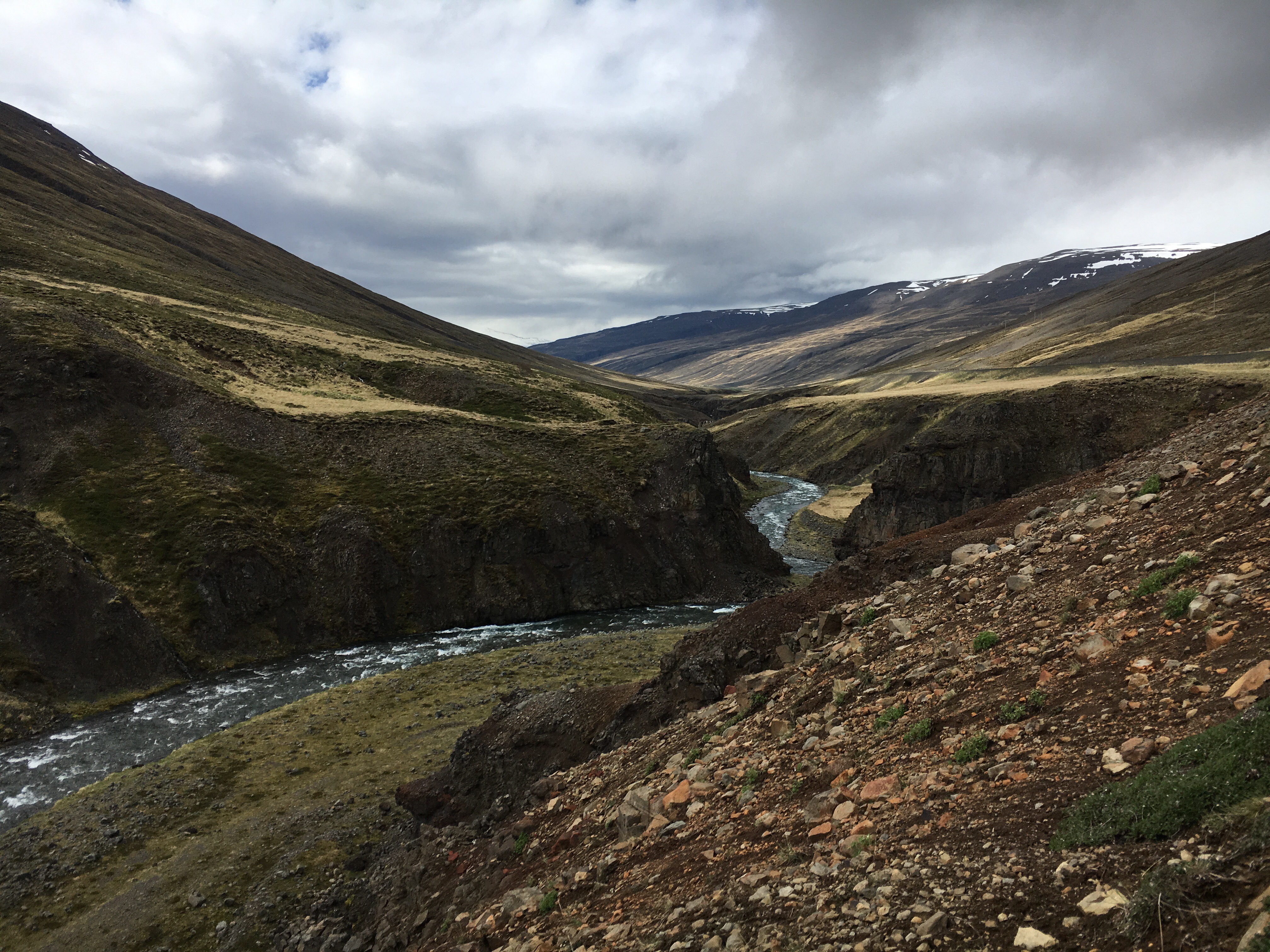 越往前走天氣越好,經過一個山谷之後,天氣就完全放晴了。這個路程,似乎是沿著一條河流由上往下。在上游的路段,在路邊就可以看到溪流沖削河谷的地形。