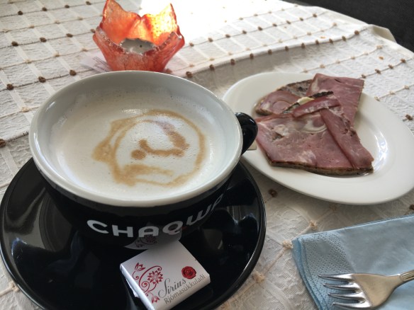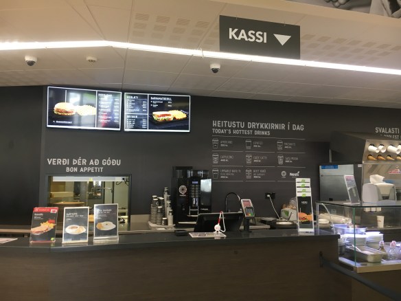 我們到了旁邊評價非常高的咖啡廳Ömmukaffi 喝咖啡。一杯咖啡是五百多塊克朗,並不是太貴。我們也試了冰島產的羊肉火腿餅,也還不錯吃。後來才發現有網友說這裡有他們吃過最好吃漢堡,可惜沒有吃到。