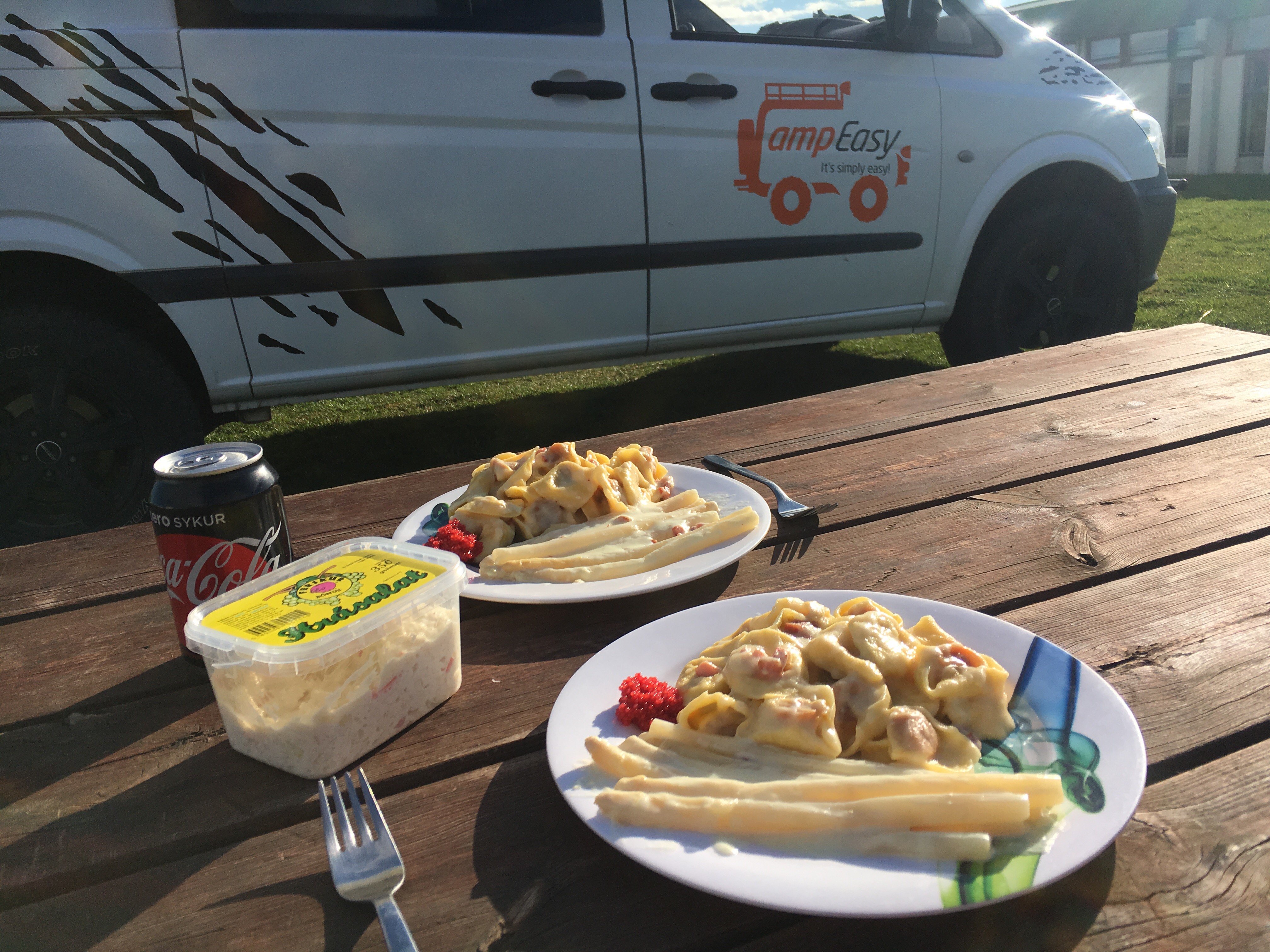 今天晚上,我們吃的是白蘆筍加上義大利餃子。白蘆筍罐頭,在這邊竟然只要五百多冰島克朗。因為天氣很好,太陽下的溫度沒有這麼低,我們也終於有機會可以在戶外桌上吃飯。