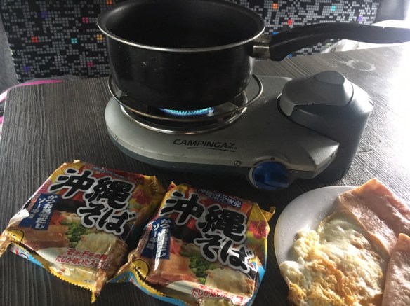 開了一百多公里路,已經到了午餐時間。我們在瀑布旁邊,很快地煮了泡麵,終於把我們從台灣帶來的泡麵都煮光了。早餐多煎了兩顆蛋,也直接搭配泡麵來食用。