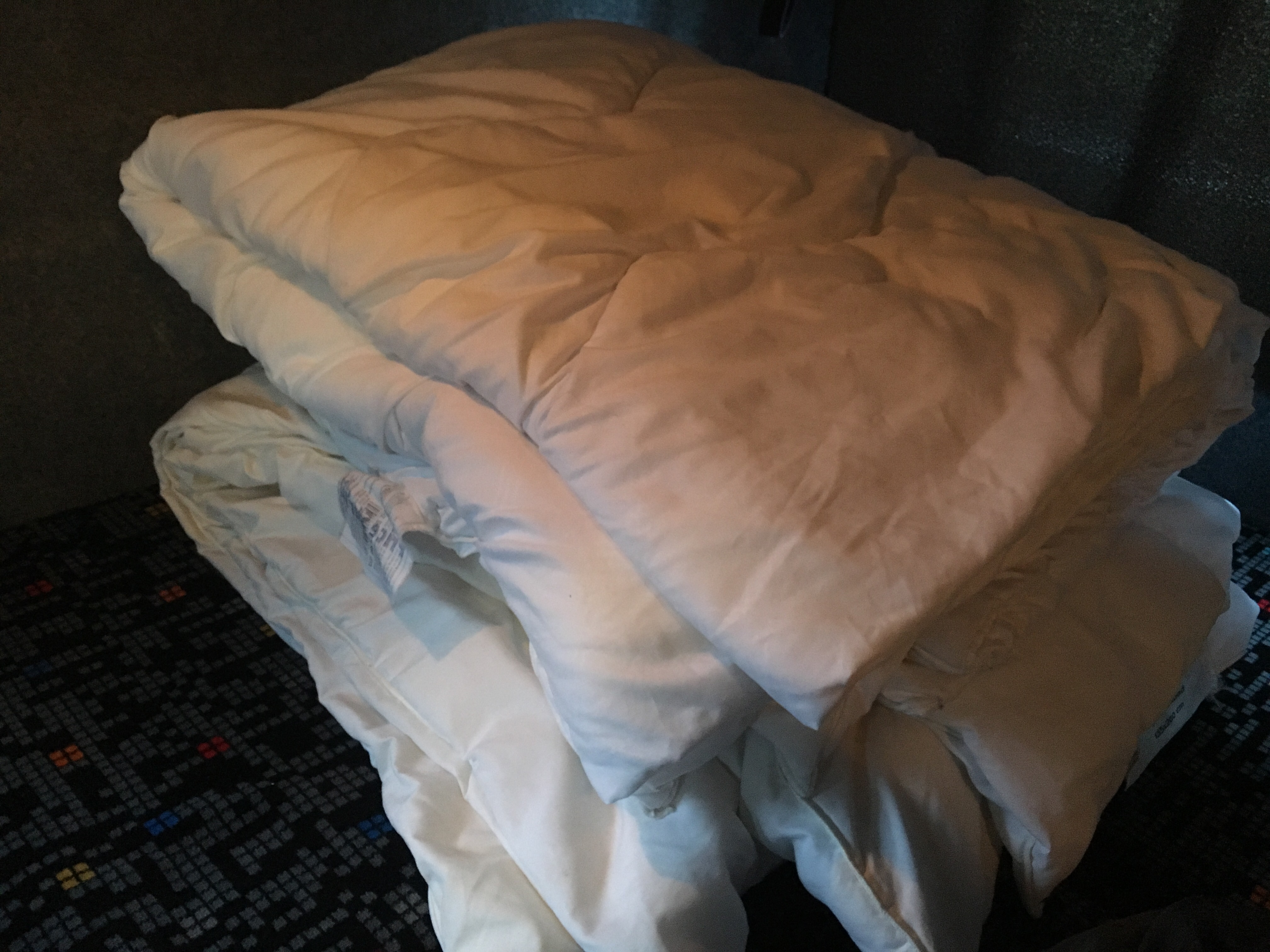 我們訂的床,在定位的時候本來以為沒有棉被,但拿到車的時候才發現有(可能是被升等了吧)。害我們白白扛睡袋來這邊。除了棉被之外,還有附床單、抹布、小毛巾。不過,在晚上室外的溫度也是在10度以下,如果不開冷氣的話,我們有時會覺得棉被不大夠用,所以還是需要睡袋。