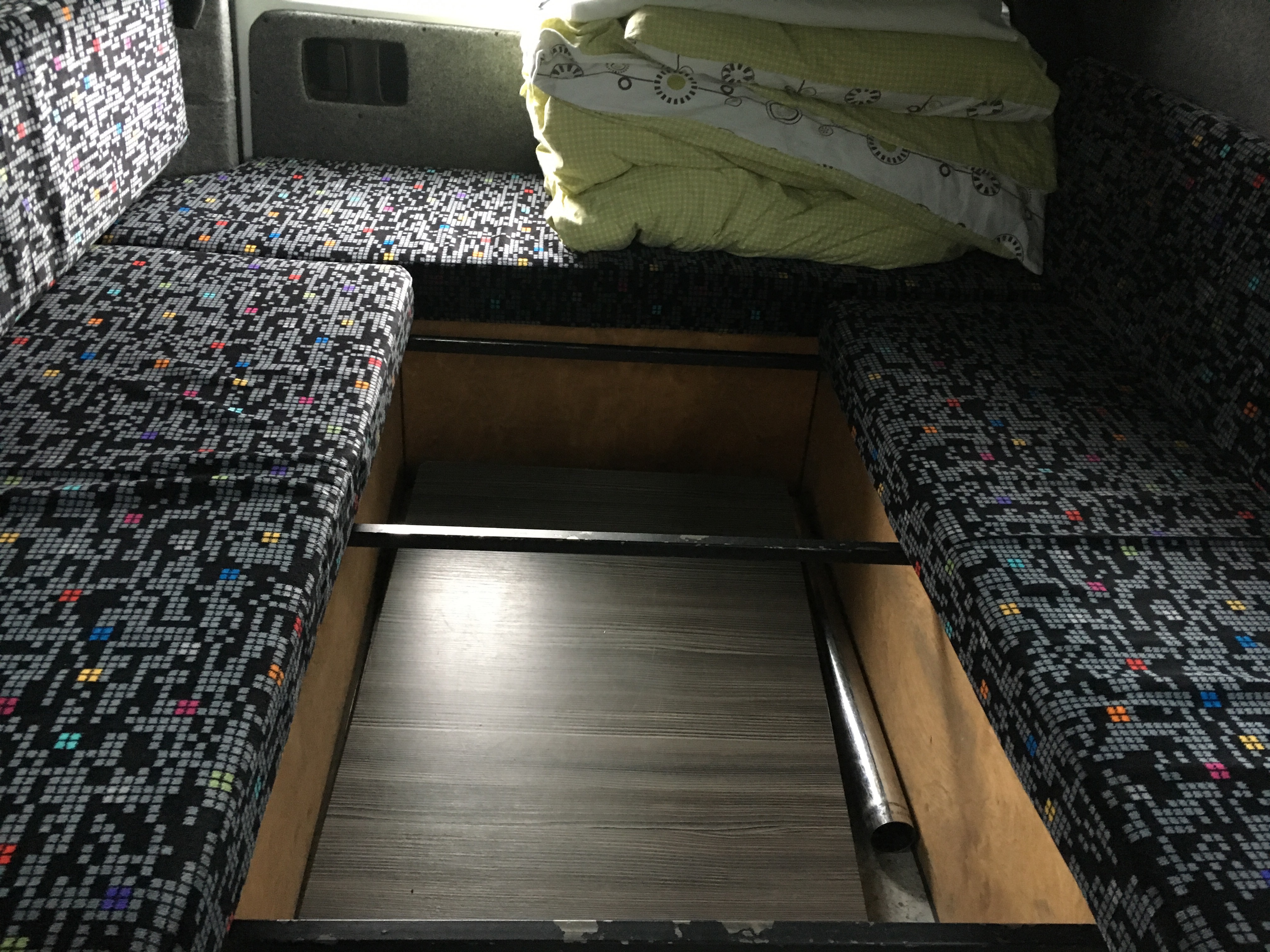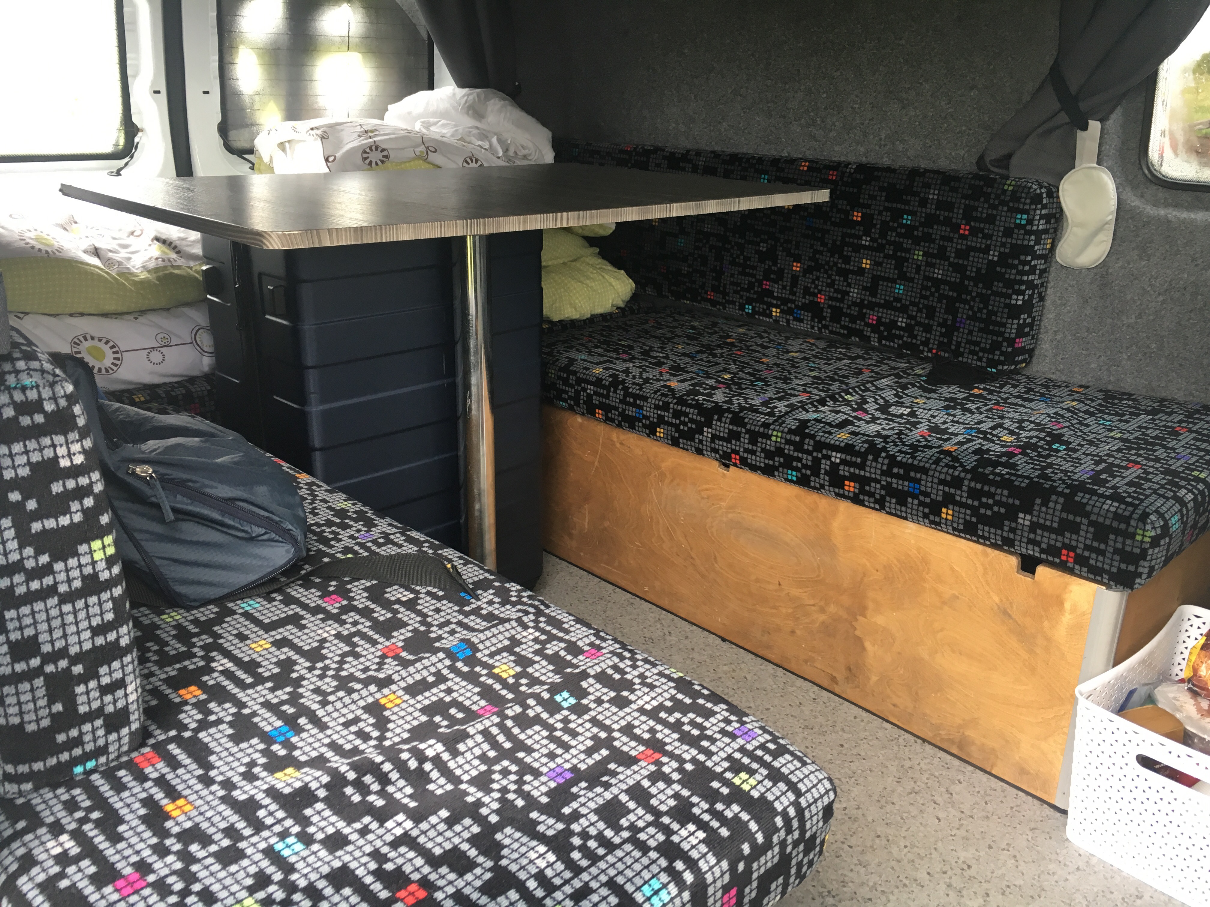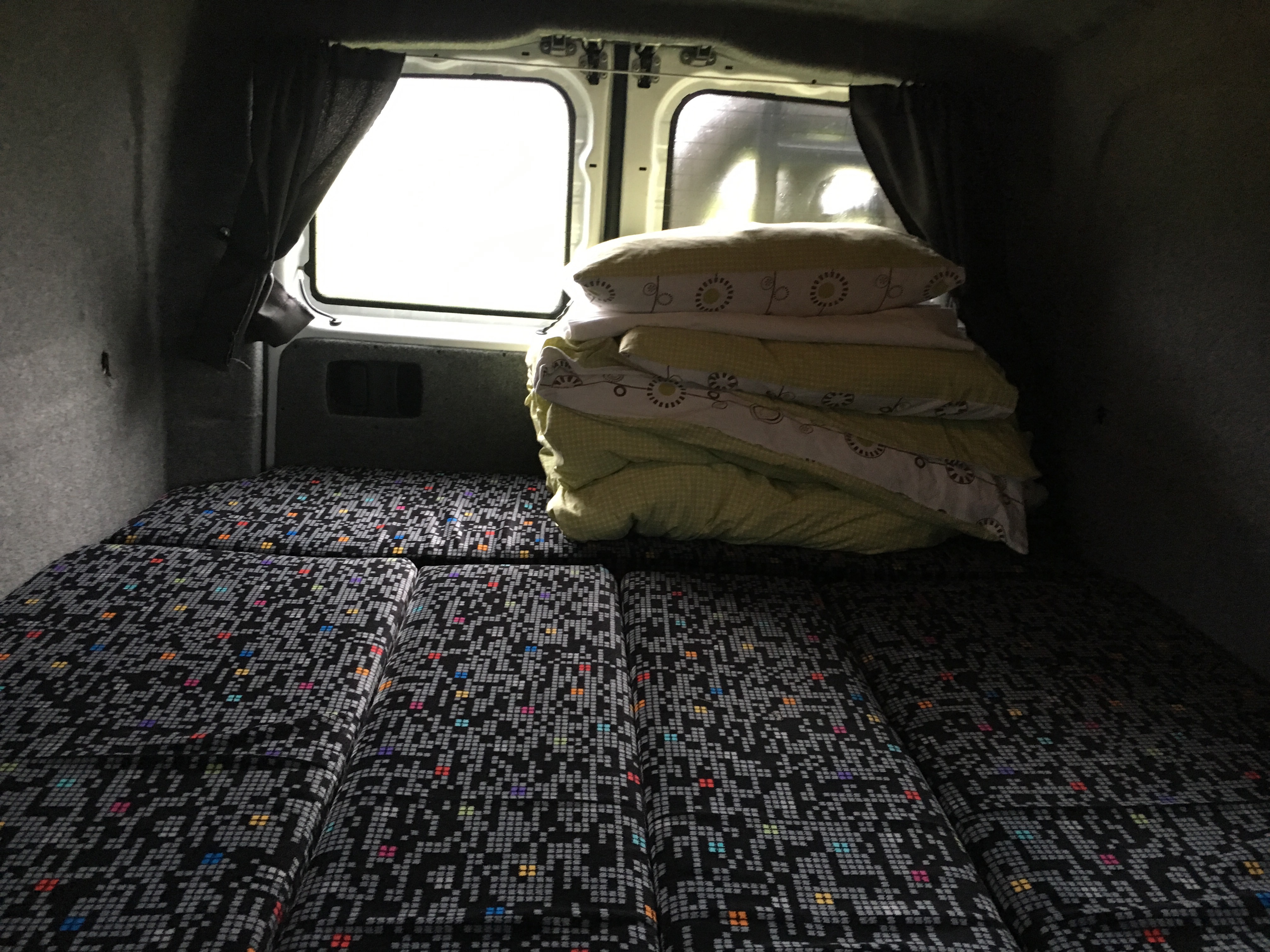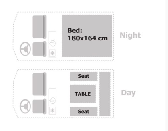 這台車基本上的設計很簡單,基本上前座可以供三個乘客搭乘,而後面的用餐與睡覺區也是給三個乘客。車後面的用法有兩種,一種是用餐有一張桌子,另外一種就是睡覺。床的長度是180公分,這個長度對我來講有點短,必須要睡斜一點才可以。