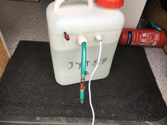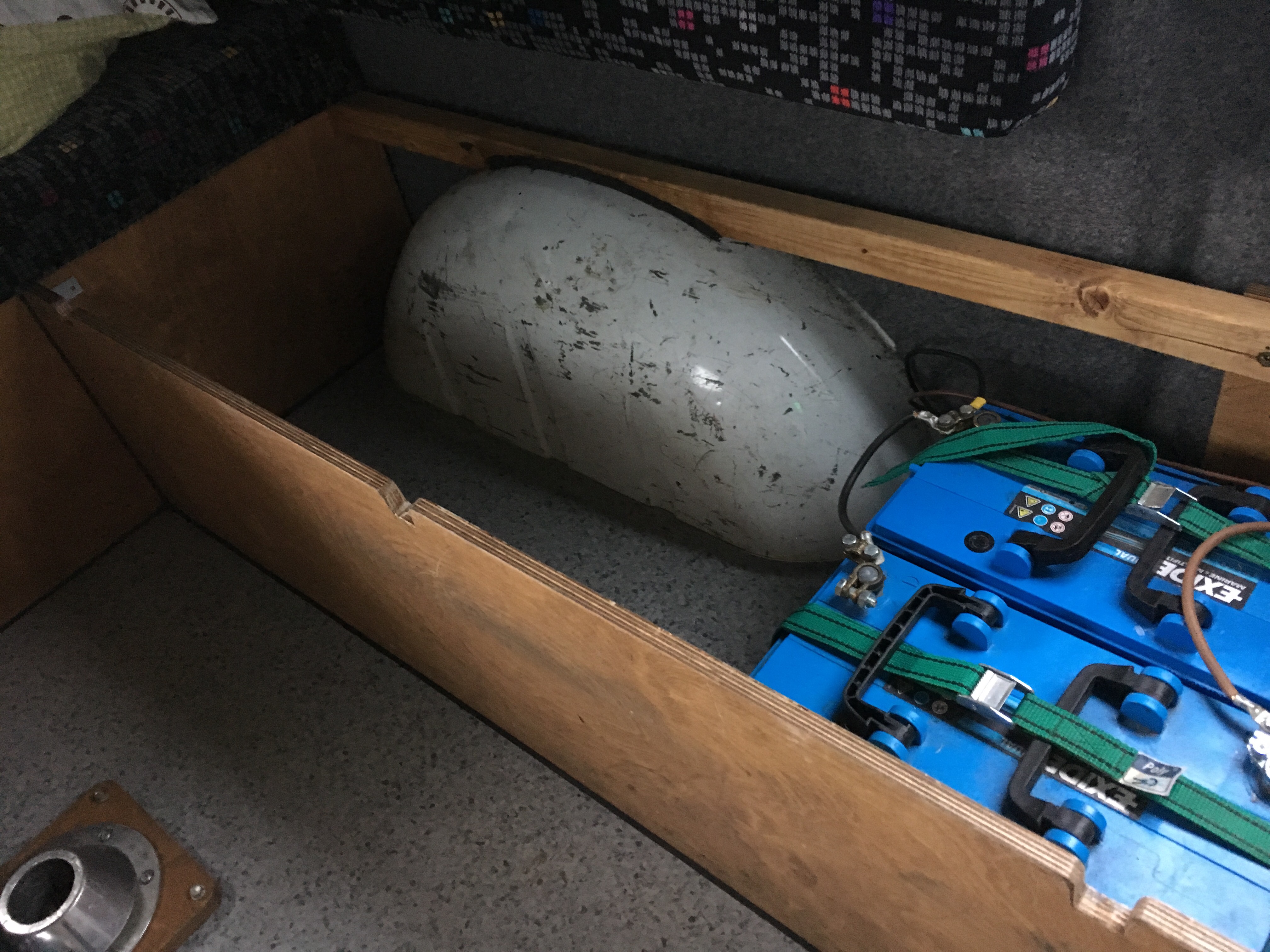 洗手台的下方就是水桶,幫浦有電線以及水線。跟日本租的露營車一模一樣,只是日本出的露營車還有污水桶(害我那時都不大敢在車上洗碗),這邊的露營車則是是直接排到車外。
