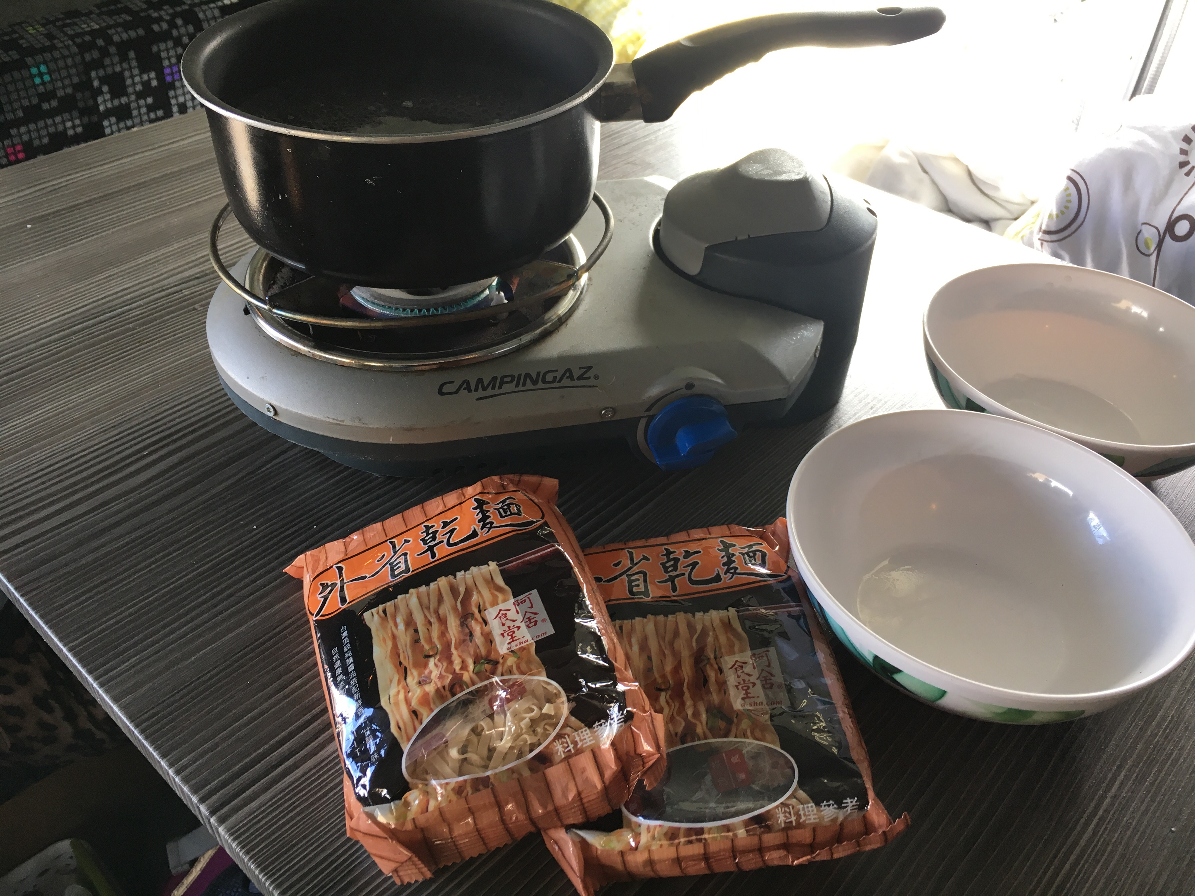 車上有附一個瓦斯爐,用起來的時候有點心驚膽跳,怕會燒掉車子裡的東西,不過用久了就習慣了。