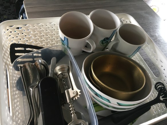 車子有附一組餐具,包括幾個塑膠碗盤、塑膠杯、叉子湯匙,以及一個煎鍋與煮鍋。餐具大部分是IKEA的,而鍋具多半是不沾鍋。