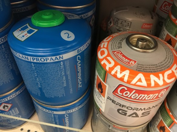 這邊的瓦斯罐有兩種,一種是按壓式跟我們車上的瓦斯爐一樣,另一種則是旋轉式,跟台灣用的爐頭是同一種。下圖左邊按壓市,右邊是旋轉式。