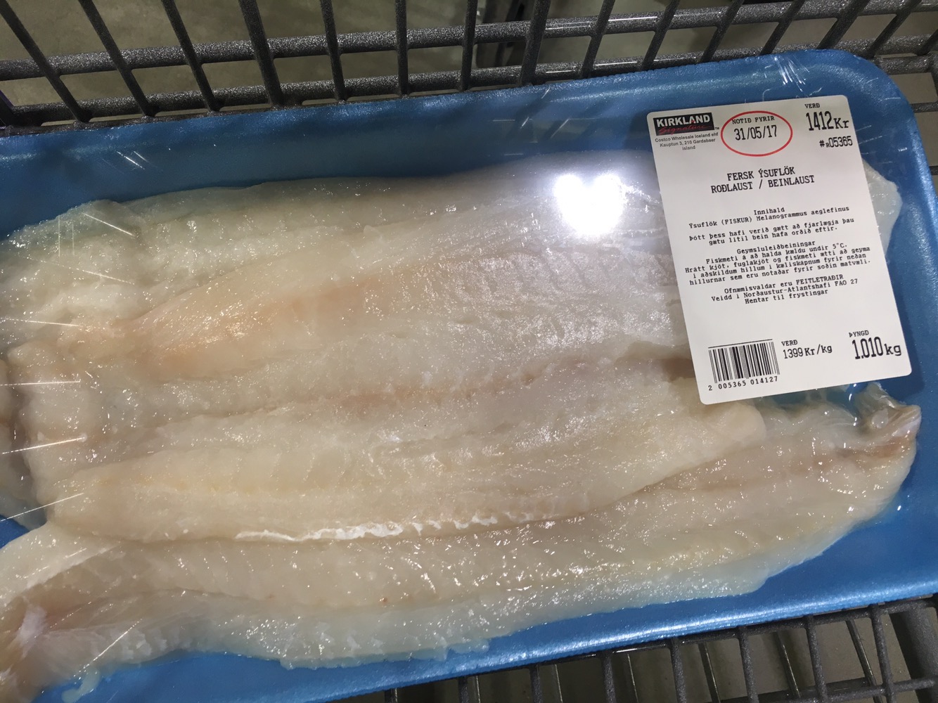 來之前就知道本地產的肉類主要是羊肉以及海鮮。因為自己對於羊肉料理不太有自信,所以就鎖定購買這邊的魚肉。大包裝的魚排,是1412冰島克朗,我們兩個人一共吃了三餐,覺得還算是合算。