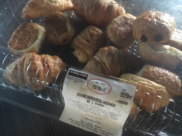 再來,是大包裝的麵包。跟台灣一樣,這邊有兩袋包裝的貝果,不過我們最後選的是30個包裝的可頌,一半是原味、一半是巧克力,價錢是999冰島克朗,足夠解決整個禮拜的早餐。