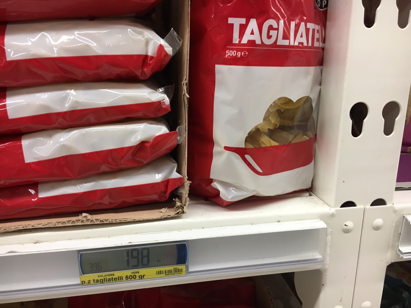 說到義大利麵與義大利餃子,這就是小豬超市出場的時候了。我們買的義大利寬麵,是義大利製的,不是我迷信舶來品,義大利做的義大利麵真的很好吃, 198冰島克朗六人份。