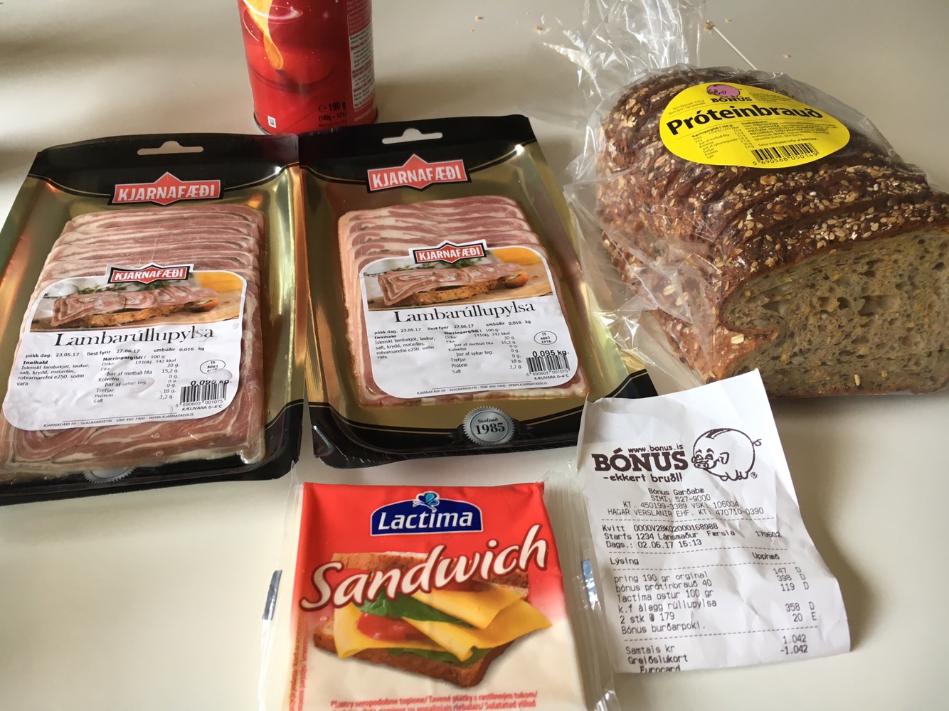 在沒有開伙的中午,甚至在還車之後,我們也嘗試自己做三明治。我個人覺得,羊肉火腿(一包179冰島克朗)是很值得嘗試的。我在小廚超市,買了以下的羊肉火腿、起司麵包,還加了翹鬍子洋芋片(不知道為什麼這麼便宜,159克朗),才1000出頭冰島克朗。