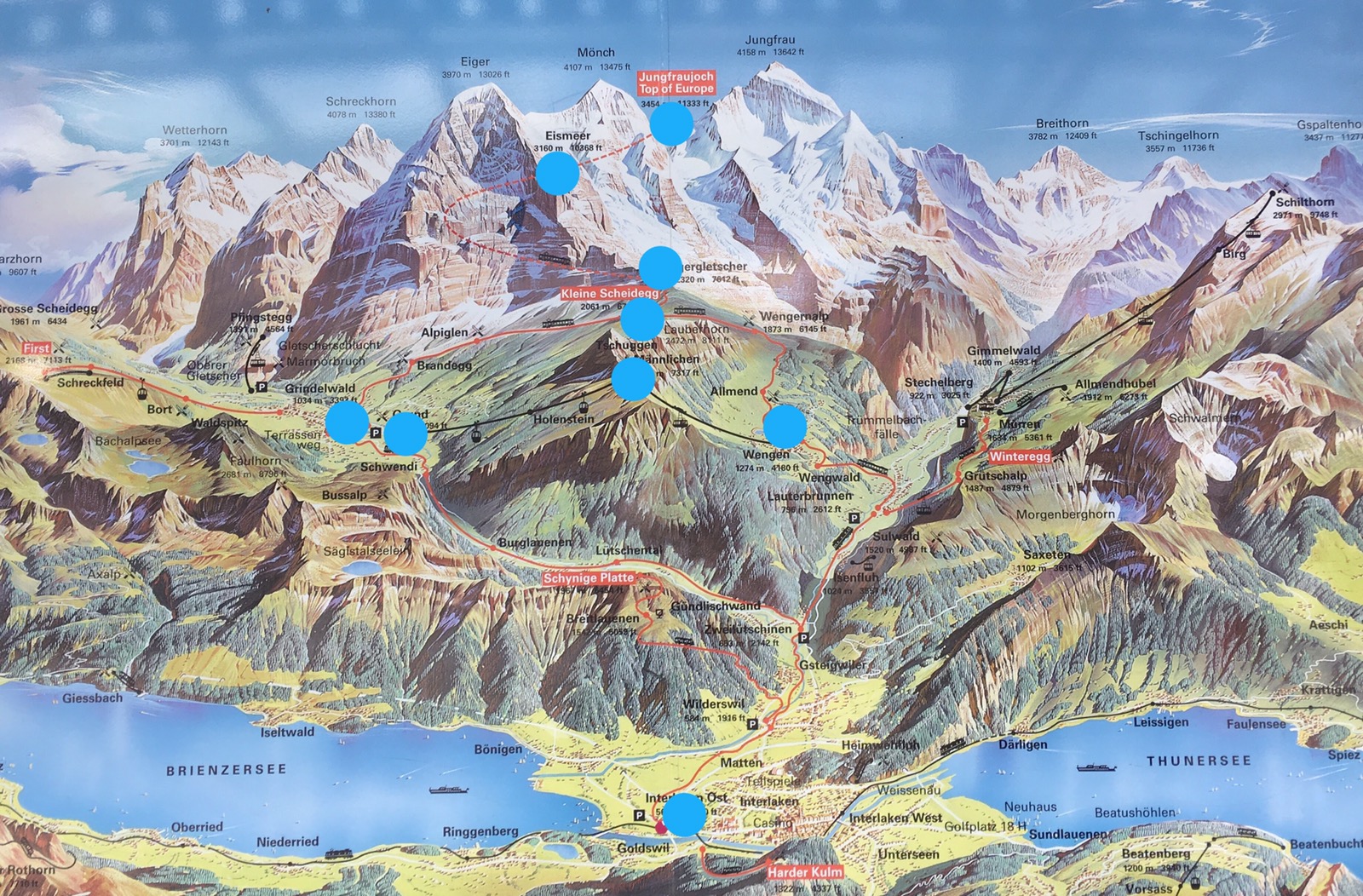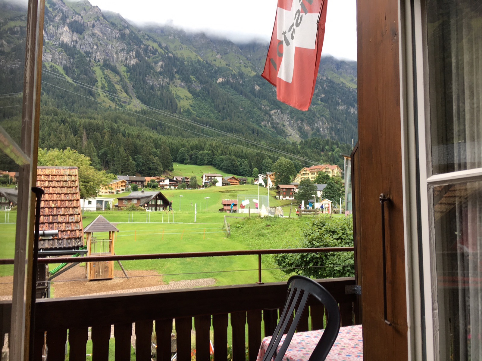 在巴塞爾先經過德鐵DB的車站,再到瑞鐵SBB的車站,轉往因特拉根的火車。一路折騰,到了因特拉根已經是下午三點。中間經過瑞士首都伯恩,可惜沒機會下去走走。一過伯恩,標準的瑞士草原地形與木屋就出現在面前,真是人間仙境無誤。也難怪清境被稱為小瑞士,大概有30%神似吧。