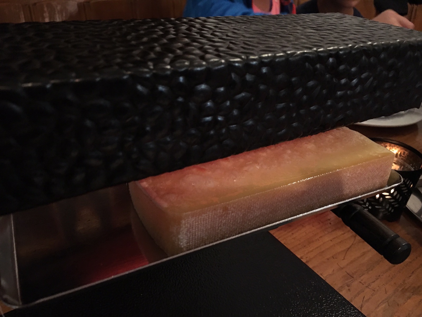 晚上本來想在超市解決,不過要20 CHF才能刷卡,後來還是去餐廳吃。旅館一樓就有餐廳,不過人數不足無法叫 Fondue。隔壁點了Raclette,是瑞士名菜,用特別的桌面烤箱加熱,特別去拍了張照。
