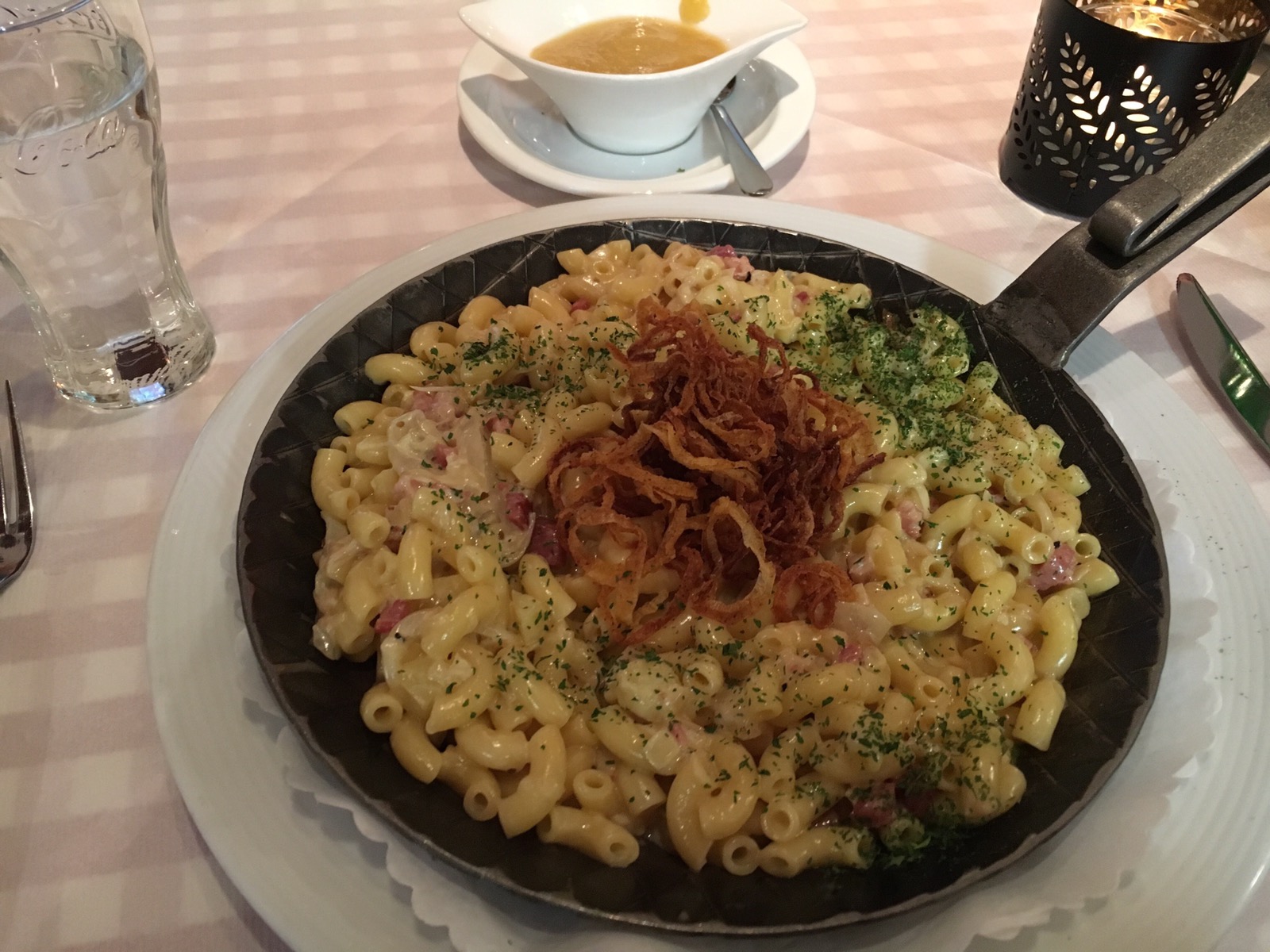 我則是點Älper Maggronen,是少女峰一帶的名菜,其實就是通心麵,不過搭配蘋果醬與炸洋蔥,19 CHF外加2 CHF的白開水。