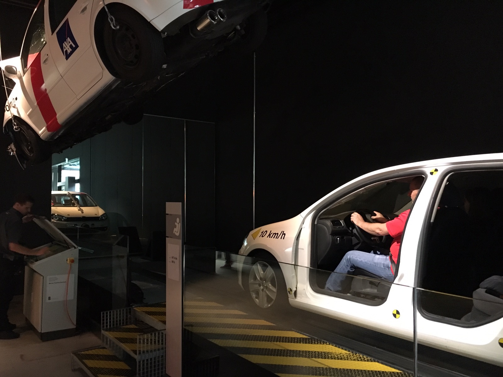 整個汽車博物館,也環繞著安全駕駛這個主題。在這邊有碰撞測試,遊客可以試著在每小時10公里的速度下,體驗一下車禍的感覺。