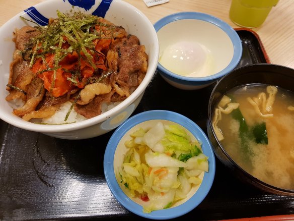 入住後我跑去附近吃飯,程序是先去櫃檯還置物櫃鑰匙,然後拿回鞋櫃鑰匙。附近吃的東西很多,不過過年期間都是連鎖店有開,吃了松屋的烤肉飯。