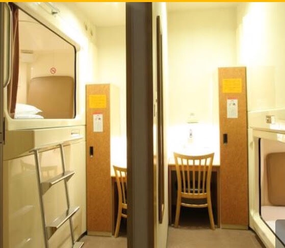 下圖就是我居住的「客室」房型,一張桌子上面有插座與檯燈,旁邊是置物櫃。膠囊裡有乾淨的睡衣跟毛巾,主要是提供給去大浴場之用,加上一個電視。我的膠囊是下層,上層則是另外一間客室使用。「客室」型定價4500日幣,另外沒有桌子的「一般」房型,則是3500日幣。