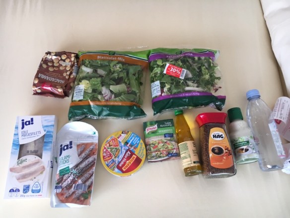 來德國之前,我正好也開始低碳水化合物的飲食方式,也就是所謂的生酮飲食。德國的超市在這一點,就非常方便了。我住的地方附近有一家很大的REWE,在裡面買一些生菜沙拉、火腿、起司、魚肉都很方便。很輕易的就可以準備晚餐。魚肉除了鮭魚之外,也有號稱窮人的鮭魚之稱的鯡魚Matejas,搭配沙拉很簡單。
