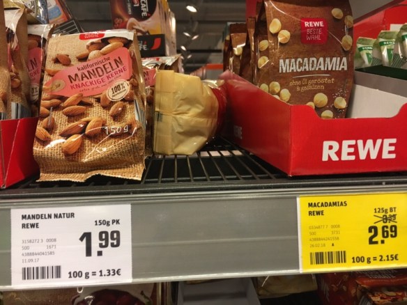 另外一個很便宜的是堅果。以碳水化合物最低的兩種堅果杏仁豆以及夏威夷豆來說,每超市的自有品牌都只要2歐元左右,非常便宜。另外一個大家可能也都知道的,就是維他命C了。但是我發現除了維他命C之外,這邊還有綜合維他命及礦物質的發泡錠,價錢實在低的很誇張。