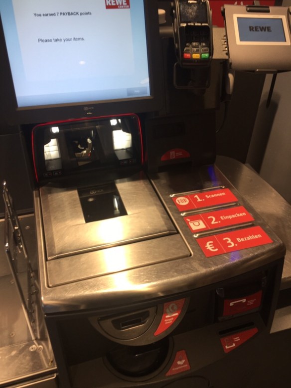 在某些REWE,也配備著無人櫃檯。這種櫃檯我在日本跟美國都見過,比較厲害的是他們可以收歐元的現金,而且找錢非常快。