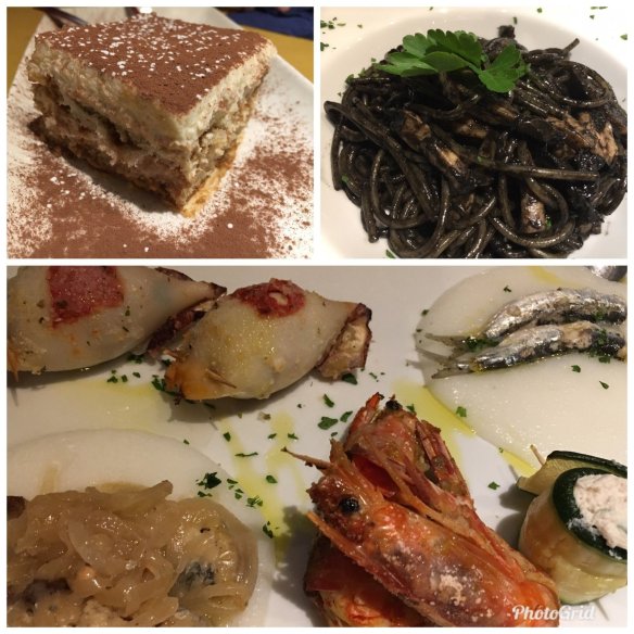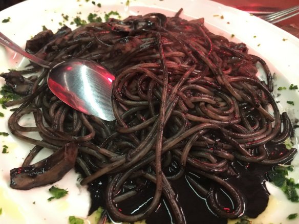 除了這個之外,我們又叫了一定要叫的墨魚義大利麵。我們查了了背包客棧的一些文章,發現義大利的水好像不能直接喝,所以在餐廳點水一定要付錢的。可是大部分的餐廳也都有提供所謂的House Wine,一個人大概是3歐元,比起2歐元的水也都不了多少,所以我們都是點酒。至於服務費,很多餐廳也是省不了,這邊也是一個人2歐元,但是含麵包。還點了提拉米蘇。