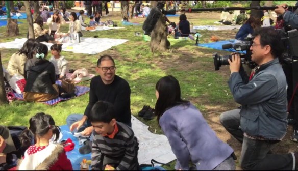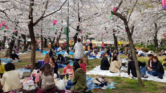 很幸運地,鶴舞公園管理方把遊客用完的地墊集中,然後有一組遊客又剛走,我們取得一席之地。除了賞花,遊客們當然準備吃的喝的。我們則是買了夜市的丸子、章魚燒、炒麵吃。