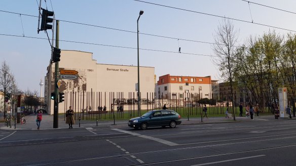 上次來柏林的時候就到過這個柏林圍牆的舊址,這是從不同的方向經過,會穿過柏林圍牆。也就是說我旅館的所在地應該是西柏林,有穿過這個馬路之後,就來到了以前的東柏林。