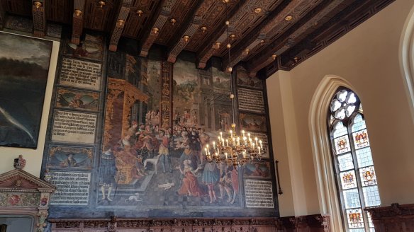 導覽員很仔細的講解了牆壁上的畫,譬如說牆上有一幅所羅門王排解兩個婦女爭奪小孩的故事,掛這幅畫的原因是因為以前的市政廳也有法庭的功能,是掛給法官看的。