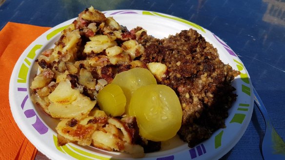 有一個網友,對這個料理方式評價不大好,但是我覺得非常好吃。Knipp其實是一種香腸,使用方式是把它剁碎,並且加入一些穀物來拌炒,搭配炒馬鈴薯以及黃瓜,我覺得很讚。唯一的問題可能是份量太多了,不過我真好有帶著一個保鮮盒,就把它打包帶走。