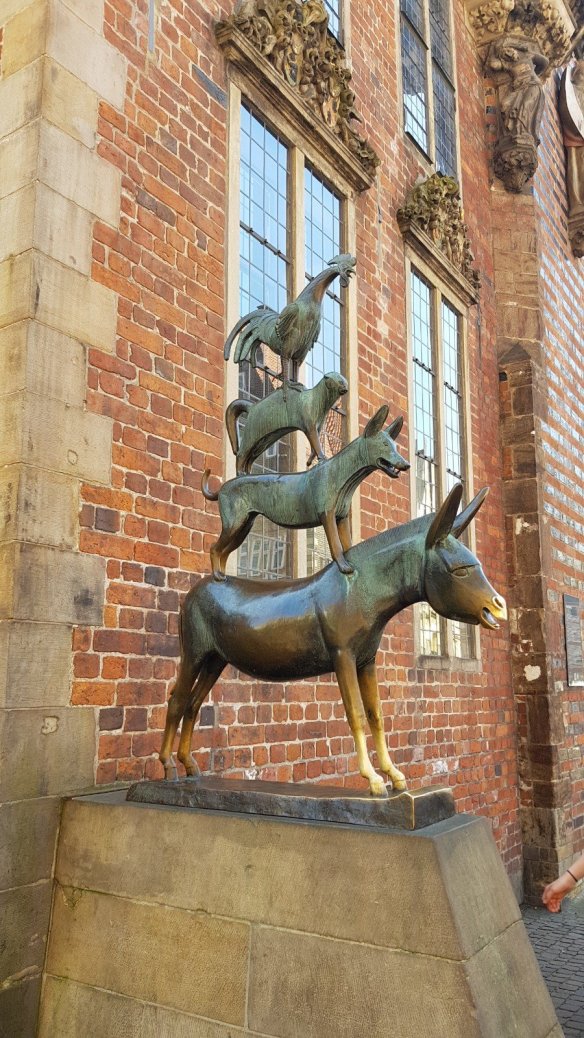 離開市政廳之後,當然就是去附近的不萊梅音樂家雕像照相。感覺這還是在德國很家喻戶曉的故事,而且是格林兄弟寫的。我所居住的哈瑙,就是格林兄弟的故鄉,也是童話大道的終點,而不萊梅就是童話大道的起點。