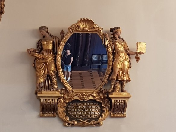 還有一個裝潢非常漂亮的黃金密室。不過這裡沒辦法進去。導覽過程當中,導覽員也講解了一些不萊梅的歷史。不萊梅是在中世紀時建立的,最初的建築物是教堂。慢慢這邊的商人想要脫離教堂的控制,所以就建立了市政廳,以及附近的商會,並且與其他的港口城市結盟,成立的所謂的漢莎聯盟。不萊梅跟另外一個漢莎聯盟的重要城市漢堡,也多多少少有點心結。