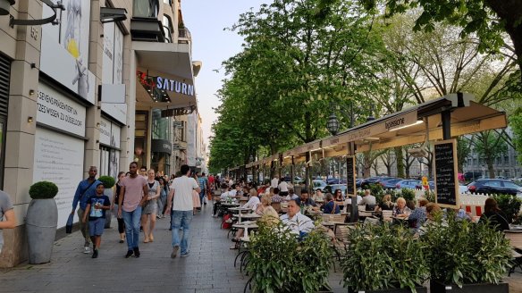 從日本區往前走,就會來到著名的國王大道。而這邊也距離萊茵河不是太遠。國王大道最著名的就是中間的運河,其實杜塞道夫有很大規模的港口,可以想見這邊的水路運輸非常的發達。星期六的傍晚,國王大道滿滿都是高朋滿座的餐廳。