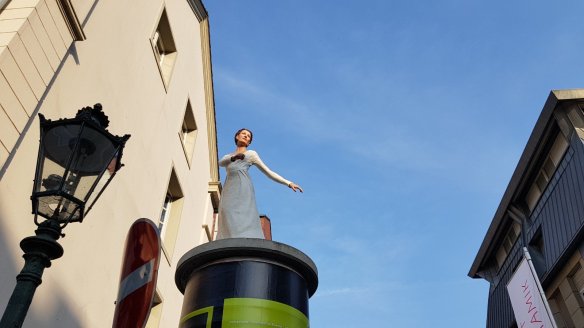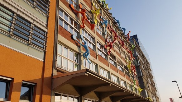 舊市區裡,還是有一點巧思的。譬如,在廣告招牌上面的人像,就頗有意思。杜賽道夫是北威州的首府,卻不是最大的城市。據說科隆的居民對此多多少少有點意見,跟杜賽道夫的居民有點心結呢。
