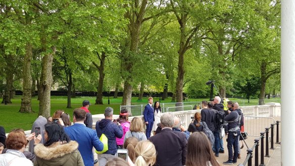 一個不起眼的角落,出現一男一女被採訪的身影。正好下週哈利王子與梅根要結婚,街上很多有他們照片的紀念品,加上梅根演的連續劇我又看過,下意識就覺得是他們。
