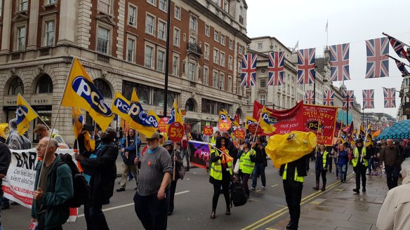 到了主要街道Piccadilly街,遇到了一場示威抗議。說是示威抗議,反而像是大遊行,是由全國公務人員團體所組成的要求加薪遊行,包括公務員工會、教師公園、甚至共產黨都有加入。
