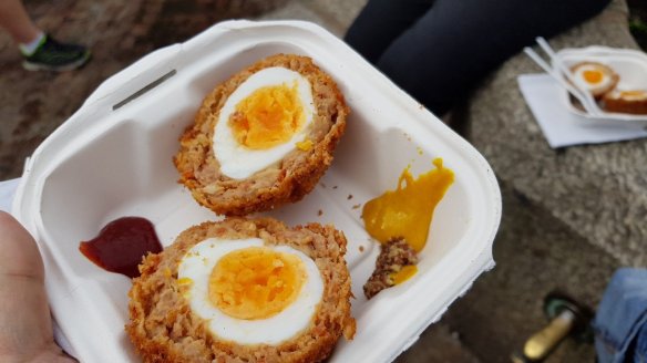 我們中午只在劍橋市集吃了蘇格蘭炸蛋,這個我們在亞洲酒吧50強的貓下去吃過,這是貓下去甚至可以做出溏心蛋。不過還是好吃,這邊有起司或莎朗口味可以選。
