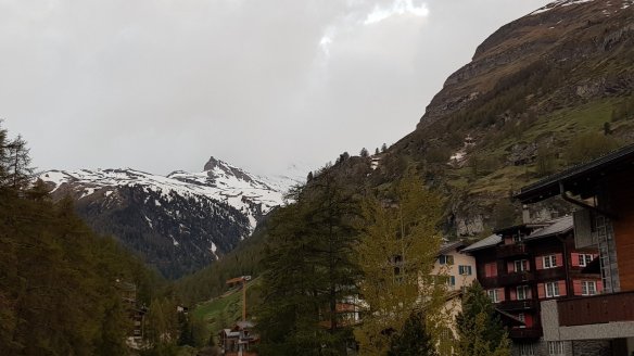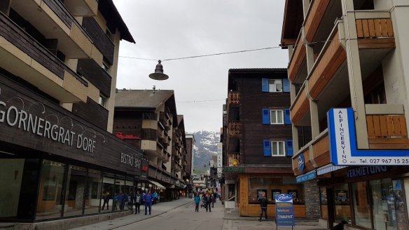 到了策馬特,也差不多是下午五點了。由於是五月,太陽是晚上九點才下山。所以跟鎮上的觀光客一樣,我們在貴鬆鬆的商店街逛街。很可惜的是,雖然雨停了但是雲還是很厚,所以沒有辦法看到著名的馬特洪峰。