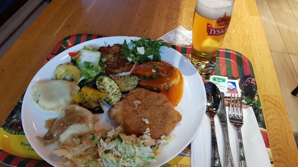 中午以及晚上,我都在車站旁的百貨公司Zlote Tarary渡過。中午吃了魚排,晚上則是吃了自助餐。查了網路上的文章,發現波蘭的餃子及豬排比較多人提,但是餐廳的餃子都很大份,所以吃自助餐就沒有這個問題,可以各式的口味都常常看。