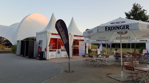 身為格林兄弟的故鄉,每年夏天都有舞台劇盛典(Brüder Grimm Festspiele),今年已經是第34屆。場地其實就是公園旁的一個豪華大帳篷(其實它真的是劇院Amphitheater),在夏天的晚上其實氣溫頗為舒服。旁邊還是照例有啤酒攤、香腸攤,當然也可以帶回看台喝。