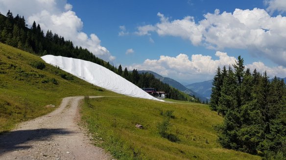 遠方可以看到兩個人工湖,這裡是用來儲水,以便人工製雪機使用。為了延長開放時間,這邊一共有999台的製雪機。也是為了人工製冰的原因,這邊也刻意保留了一大塊雪,用特殊的布包起來,據說整個夏天都不會融化。