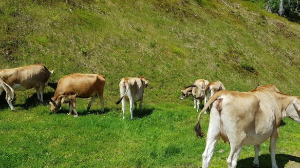 路上會經過一區柵欄內的牛群。感覺比瑞士或義大利的牛群要集中許多。不過他們沒有帶風鈴就是了。