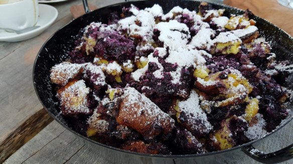 我們吃的這一間叫做Seidalm(才發現他們竟然有自己的網站以及臉書粉絲團),除了一般的咖啡與啤酒之外,這邊特殊的美食是檸檬汁與煎餅(Kaiserschmarrn)。煎餅先以一般Pancake的方式製作,然後再拌炒放進鐵鍋裡,再撒上糖粉。服務員的穿著也是傳統服飾,跟巴伐利亞有點接近就是了。