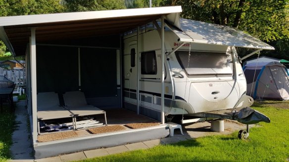夏季的奧地利,像這種五星級的營地早就已經訂位額滿。我們還是試試手氣,很幸運地工作人員找到一個營位給我們。也因為營地規模實在很大,營地工作人員必須開著高爾夫球車,才能帶我們到我們的營位。