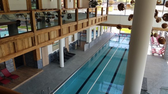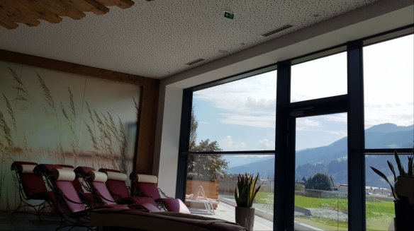 歐洲的游泳池通常有大量曬太陽的地方,這個游泳館也不例外,除了遠方的風景之外,在室內也有放置許多躺椅,在冬天的時候就是在室內看雪景了。奧地利是滑雪勝地,這個室內游泳池在冬天就變成滑雪客泡熱水的地方了。