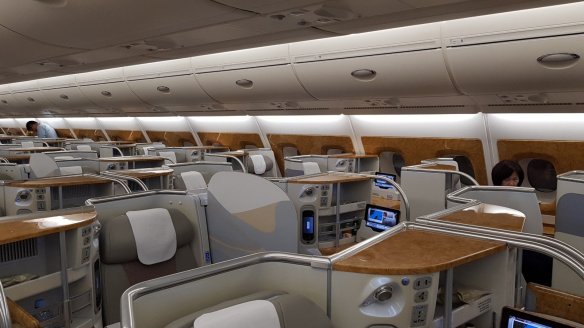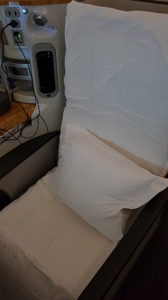 阿聯酋的商務艙是很有名的產品。我在搭乘前就非常期待。登機就不大一樣,是往上到二樓,一般登機都是往下。這是我在LH FRA-HKG後第二次搭乘A380,阿聯酋的保養狀況比德航似乎好一些。