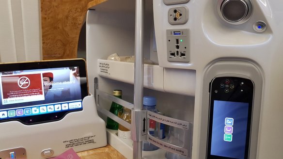 座位旁的區域非常特別,就直接放了飲料Mini Bar,包含氣泡水、礦泉水、汽水等。除了類似手機的遙控器外(A359也使用同款),還有一個平板。在飛機起飛後,才可以使用。