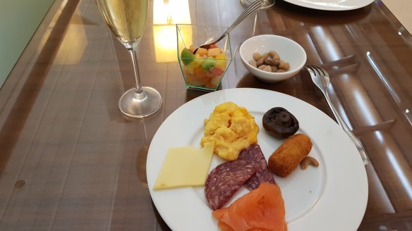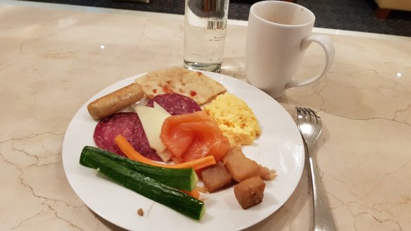 早餐我選擇了蛋捲,熟度的掌握非常適當,水果、麵包等配菜也正常發揮,算是中上之作。只是這個早餐來的比較短,之前的晚餐(貴賓室與飛機上)還沒消化完呢。