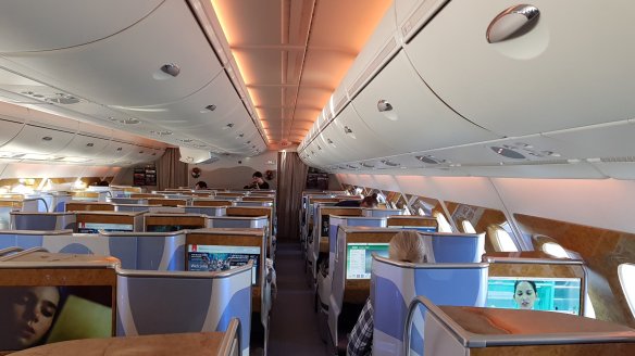 座位是A380標準的正向座位,不是魚骨式。這一天客人不是很多,商務艙大概只有四成滿。A380上層都是頭等與商務艙。下層則是挺多團客,感覺他們也相當興奮。